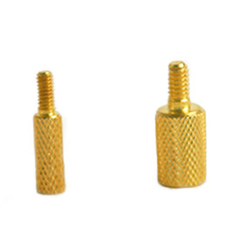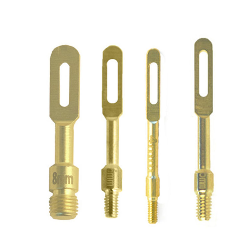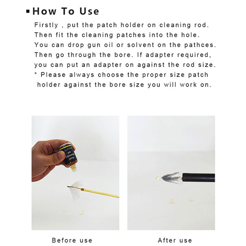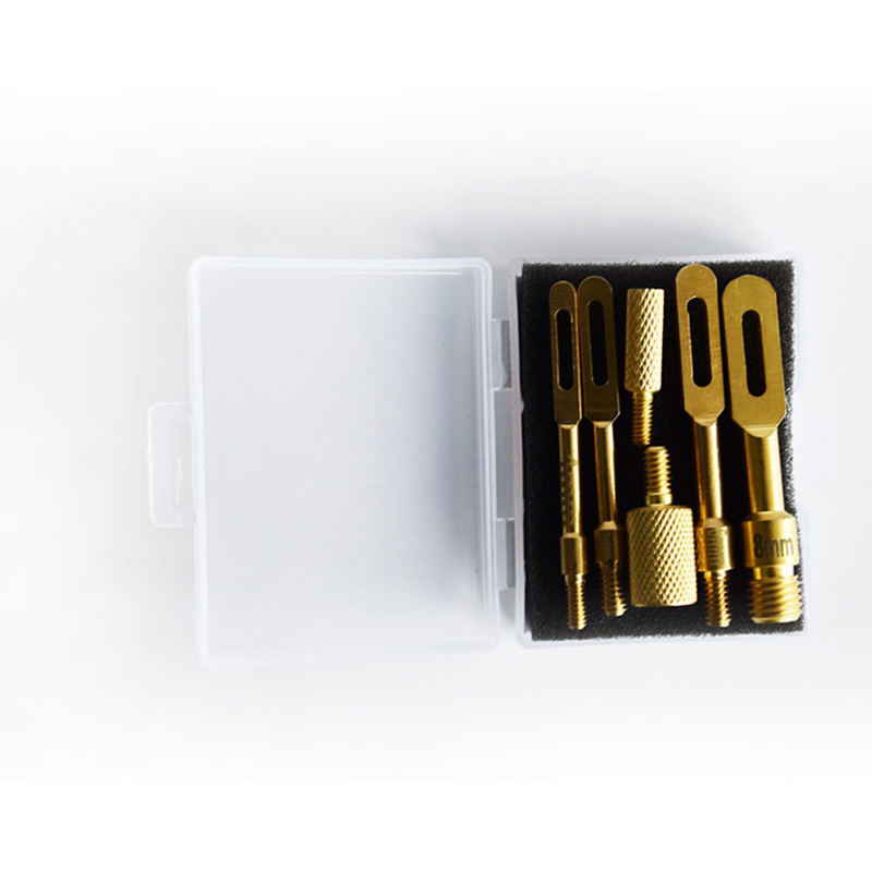 ● Die 4 Patchhalter: 4 mm in männlich 5-40, passend für .177-.223-Gewehre; 5 mm ist im männlichen 8-32, passend für .223-.270cal. Gewehre; 6 mm in männlich 5-40, passend für Gewehre .270-.357cal, Handfeuerwaffen .357-.45cal.; 8 mm ist männlich 5/16-24, passend für alle Schrotflintenstärken und Pistolen ab Kaliber .357. und auf.