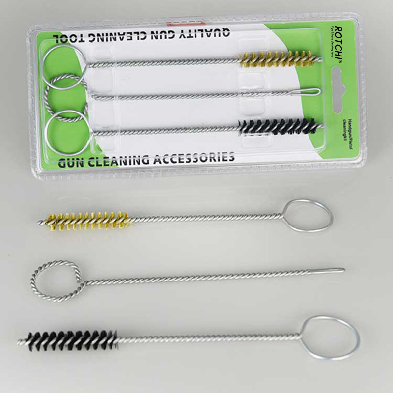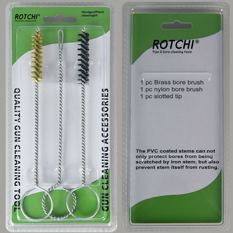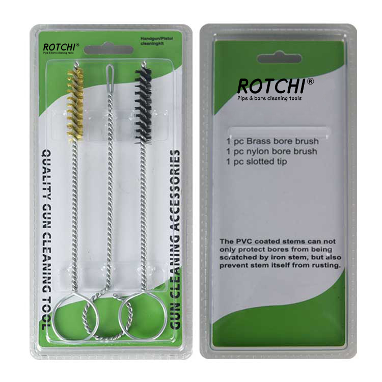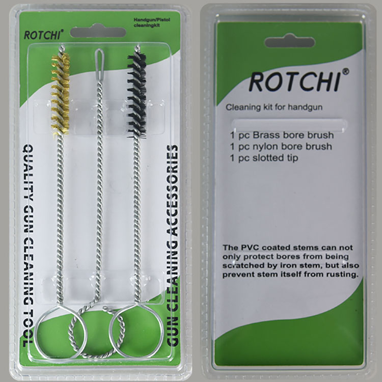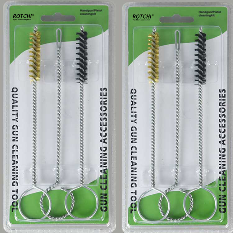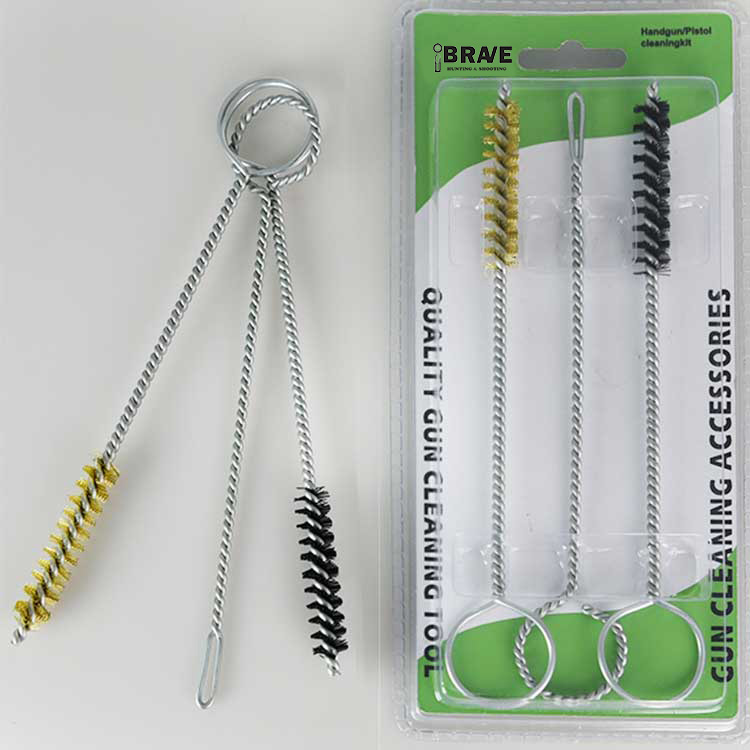 Reinigungsset für 9-mm-Pistole, Blisterpackung 3-teiliges Pistolen-Reinigungsset, verpackt im Doppelblister. Eine Reinigungsbürste für Messingbohrungen, eine Reinigungsbürste für Nylonbohrungen und ein geschlitzter Patchhalter. Praktisch und effektiv.