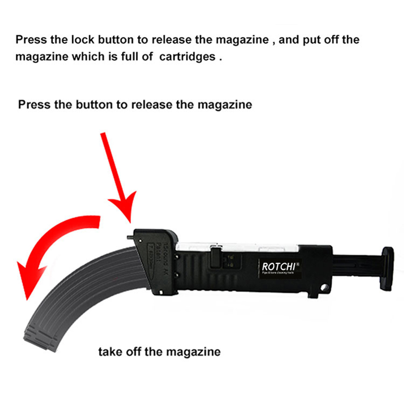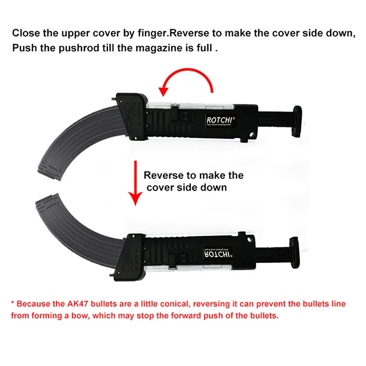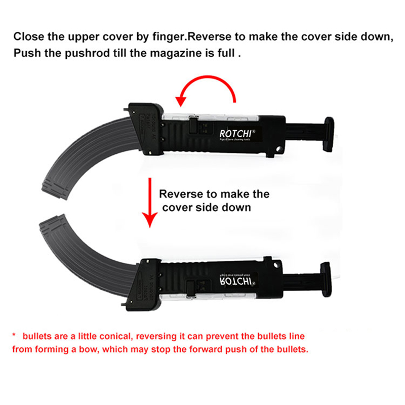 ● Wird zum Laden von 7,62 x 39 mm-Patronen in ein AK-Magazin mit einer Kapazität von 10/20/30 oder mehr verwendet.