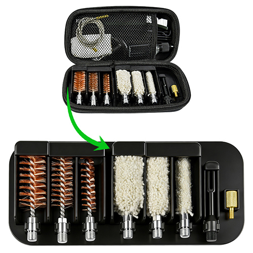 Das Schrotflinten-Reinigungsset enthält 3 Größen (12/16G, 20G, 410). Messingbürsten und Baumwollmopps, 4 Stäbchen 1 Kalbe. Sandfarben und schwarze Farbe zur Auswahl.